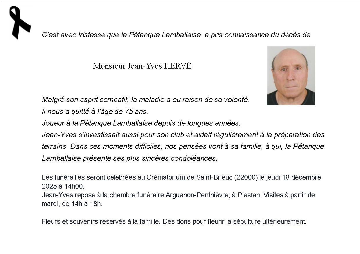 Décès d'un licencié, Jean-Yves HERVE